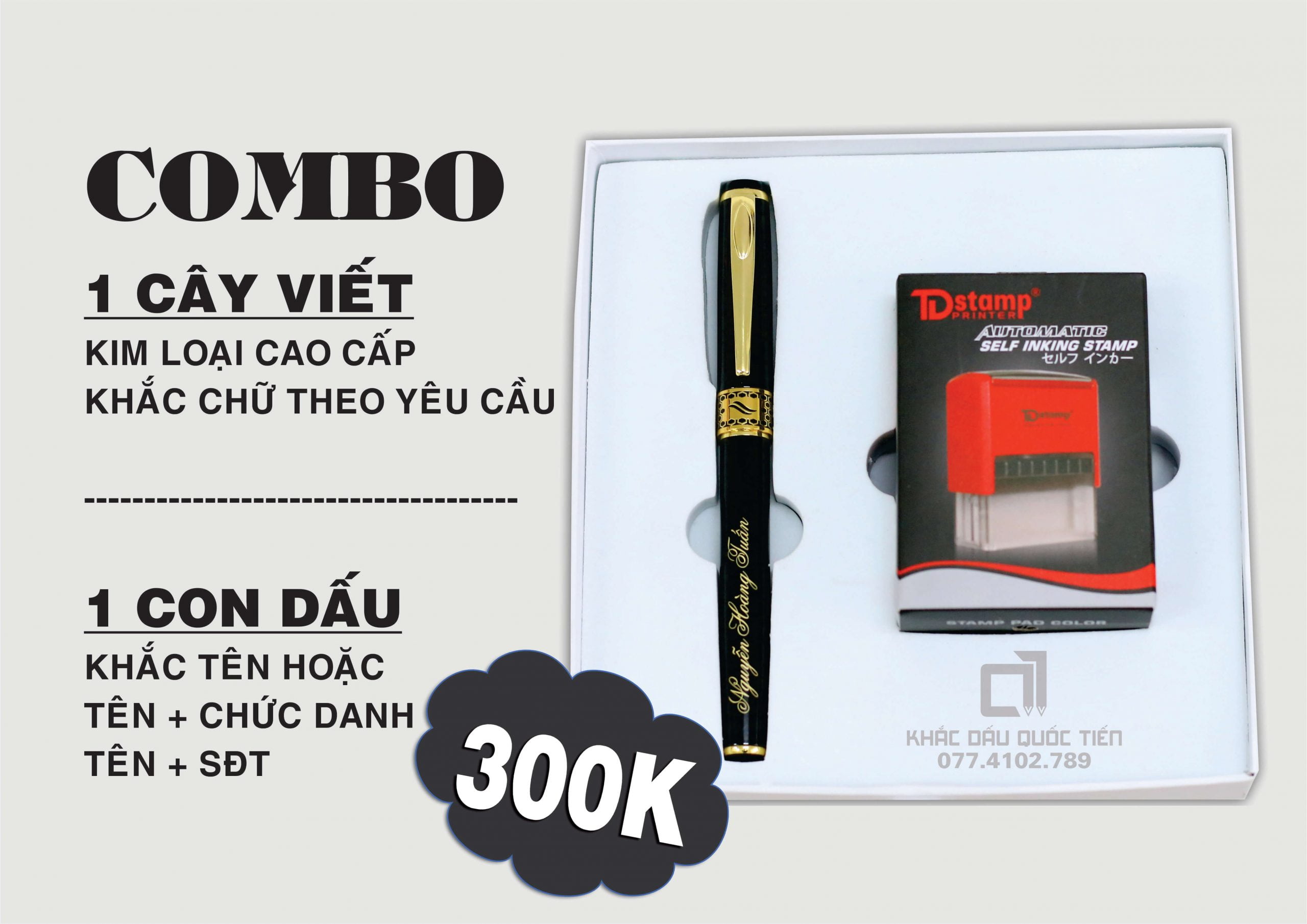 Sau khi lắng nghe và hiểu được mong muốn của quý khách hàng, Quốc Tiến đem đến combo sản phẩm quà tặng cao cấp gồm 1 BÚT KIM LOẠI khắc tên theo yêu cầu và 1 DẤU TÊN với mong muốn giúp quý khách có được sự lựa chọn tốt nhất cho mình.